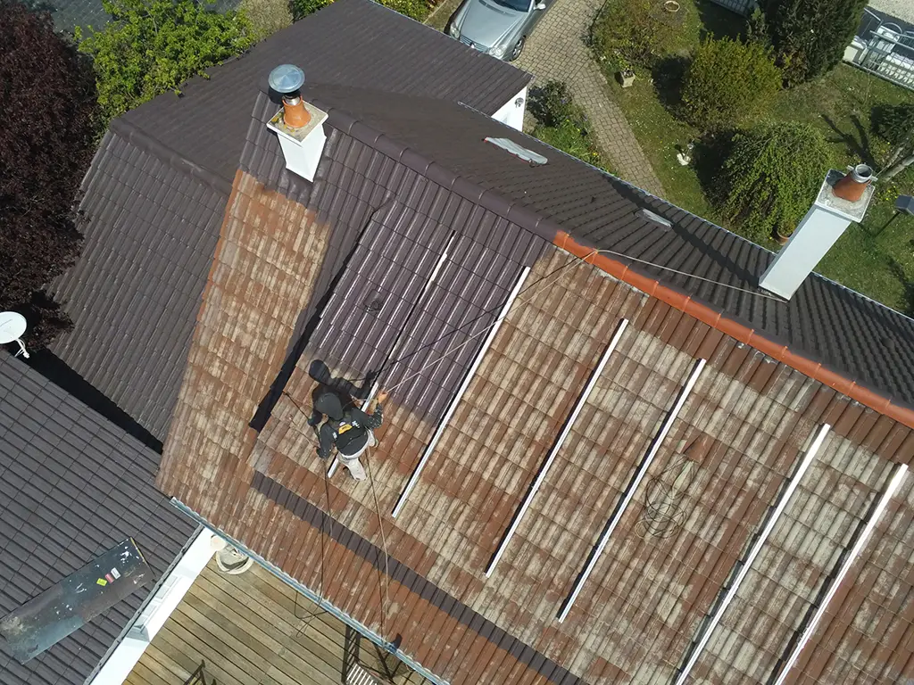 Nettoyage haute pression de la toiture, élimination des mousses, lichens, salissures